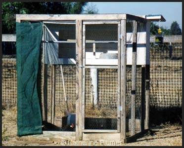 Whenever we decided to build another chicken coop (and I am in need of yet another) we would visit all the local chicken high-and-mighties, look at their coops, and sort of synthesize all the good things about each one of them. I highly recommend that method. The pictures I have here are just that--pictures. I am not giving out the plans because, well, there are no plans. The plans for these houses seem to either get written on incomprehensible little scraps of paper, or on 2 X 4s, which the dogs promptly eat. But you are certainly welcome to take a look, and get some ideas, and I will try to point out the good and bad aspects of each coop. Click on the coops for more information about each one. Sorry these photos are kind of small and crappy, this part of my website has been around for a billion years and I'm not too eager to re-scan all these old pics. I NEVER in a million years thought that this would be the most popular section of my website, but it is! About half of all the hits I get on the ENTIRE domain go to this part. Jeepers!