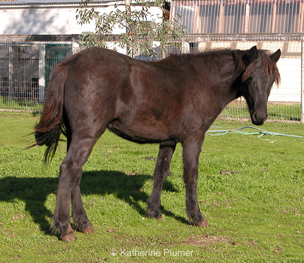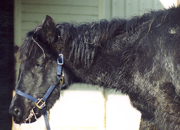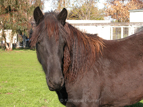 Wow, where do I even start the story of Shylah? I guess it all begins back in the summer of 2003. My Morgan/Shire mare Guinevere was not pregnant, and I was not too happy about this. I'd had her bred to a Bay Andalusian, and had hoped she would give birth to a beautiful black filly the following spring. But alas...no... Around the time that Gwen went to spend some time with this stallion, I had decided that if she didn't end up pregnant, I would adopt a PMU foal in the fall of 2004, which gave me a year to save up the money. But I couldn't stop myself from looking at all the PMU websites a year early, just to see what I would adopt if I could actually afford one right then. There were some beautiful babies, and I wish I could have taken them all. I looked at several different groups before stumbling upon one that was working with a ranch that had a herd of black Canadiens. Now I had never heard of a Canadien, but I was intrigued, so I did some research and liked what I found! It's a rather rare breed, grows to 14-16 hands tall, long mane and tail, a little bit "drafty," nice action, etc. So I started thinking that this might just be what I needed to take the place of that "Shmorgalusian" foal that Gwen would never have. I wrote to the group and asked if they would still be working with that ranch next year, and told them I would for sure get one then but couldn't afford it now. Well, no, they were not going to work with that ranch again (and now that so many of the PMU ranches are shutting down, that ranch shut down too). There was only a little over a week left until the adoption deadline, and I so wanted one of these Canadien horses. And then glory be, I was able to take out a loan from the International Bank of Mom! Yay! Only a few of the Canadiens had been photographed and put on the adoption website, since there were about 40 and they looked more or less all the same. So I sent off my money and contract and ordered a black filly with no white markings. And I crossed my fingers. Then things got complicated. Every possible delay happened. The blood testing took forever, the foals got sick and quarantined, nothing seemed to go right with the vet checks. It was an exercise in patience, and there were times when I got pretty worried that I might never get her. I had never even seen a picture of my filly... Three months after the original delivery date, they were finally on their way! I drove up to the drop-point in Kelsey, CA on the day they were delivered. There were about a dozen foals in that trailer and I didn't have a clue which one was mine. I certainly knew which ones were not her, but there were several black ones and for all I knew she could have been any of them. They were unloaded into a corral, and all of us just stood there and admired them as they wandered around and munched on some hay. There was one that kept catching my eye--a little solid black filly, no white, with lots of "feather" on her legs and a sticker with #004 on her butt. I told the other adopters how much I hoped that one was mine, but I still didn't know! Finally the paperwork came out, and numbers were matched to owners. Most people had adopted foals who were pictured, so they had a number to reference. On the list mine said "Katherine: Canadien Filly." The other Canadiens matched up to other owners, and at the end the only paperwork left was for "#004, black filly." Yay, I got the one I wanted!!!!! With the help of some friends, she came home on December 21st, and I was pretty much glued to the fence the whole day. She was wearing a halter (and to this day I am still not sure how they got that on there!) and clearly wanted it off. The first day I couldn't touch her. She'd eat out of my hand a little but that was all. I think it was the second day I was able to pet her shoulders and her back. And she seemed to have found a use for--I could scratch the itchy spots. She quickly got used to me and became very friendly. After two weeks she was finally not head-shy anymore and I haltered her and taught her how to lead. About a week later she learned to stand tied, another week after that she was good about having her feet picked up. I just figure there's no rush to do anything, so although I will come right out and admit I have no idea what I'm doing (this is all new to me!) I just take it slow and it seems to be going very well. It took me a little while to pick a name, I had to get to know her. I had several on my list of possibilities, but finally settled on the Celtic name "Shylah" for the simple reason that it sounds pretty and somehow just totally seems to fit her. She is GORGEOUS. And oh my gosh she is soooo friendly. She will walk to anyone, anywhere, just to say hello. She loves people. She has been, for the most part, extremely easy to train and work with, and she learns very fast. Shylah is truly a joy to be around, and I can hardly wait until she's old enough for the two of us to go off on great adventures. She and Gwen get along decently, though Gwen gets pretty jealous, and doesn't like Shylah to get very close. So although they hang out together and are always in the same place, they have no friendly physical contact (except sometimes I can trick Gwen into "grooming" Shylah if they are next to each other and I scratch Gwen's back). Sometimes Shylah will run around and act playful enough to get Gwen riled up, and it just takes my breath away to see the two of them galloping around the pasture. I remember being so disappointed that I wouldn't get a Gwen baby, but I think this is how it was all meant to turn out. If Gwen had indeed gotten pregnant, I would not have adopted Shylah, and I can't imagine not having her. If I had not adopted her, she would have gone to a feedlot, and that just brings tears to my eyes. And you know what, I think she looks exactly like what Gwen and Cal would have had anyway. :-) How about some pictures? :-) If you want to see them bigger, just click on them! I don't keep t